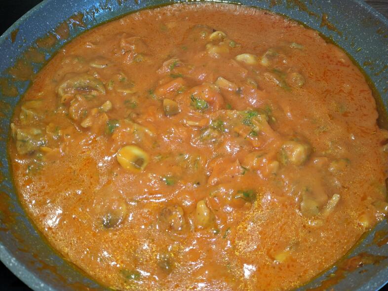 Жарить, помешивая, до размягчения моркови и испарения жидкости из грибов. Признак готовности: морковь легко протыкается вилкой, грибы уменьшились в размере.